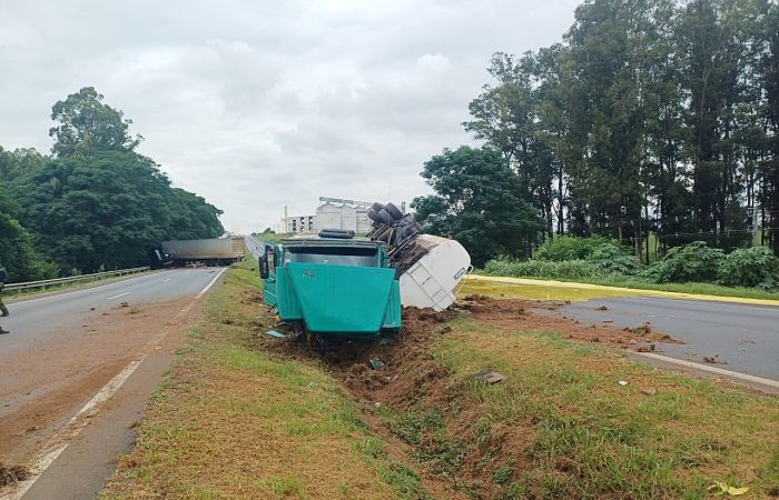 Caminhão tomba na BR-277 em Guarapuava e interdita totalmente a pista durante a madrugada