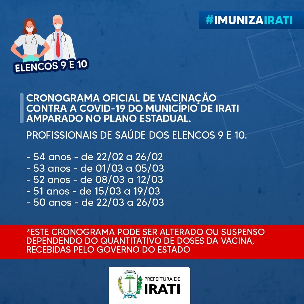 Já os profissionais de saúde com 54 anos serão vacinados entre os dias 22 e 26 de fevereiro. Na semana seguinte será a vez de profissionais de saúde com 53 anos receberem a primeira dose do imunizante entre os dias 1º e 5 de março. Na sequência, trabalhadores da saúde de 52 anos serão imunizados entre 8 e 12 de março. Os profissionais da saúde com 51 anos estarão aptos a receber a vacina contra Covid-19 entre os dias 15 e 19 março. Por fim, trabalhadores da saúde com 50 anos poderão se vacinar entre 22 e 26 de março. A secretaria de Saúde ressalta que esse cronograma pode ser alterado ou até suspenso dependendo da quantidade de doses recebidas pelo município. O calendário foi elaborado para organizar o fluxo da Campanha Nacional de Vacinação contra o coronavírus.