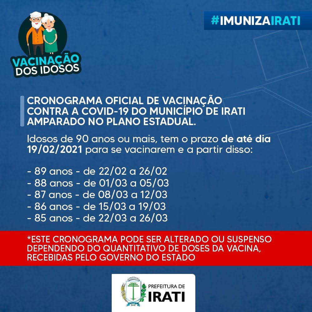 A secretaria de Saúde de Irati divulgou o novo cronograma de vacinação contra o coronavírus. Idosos com 90 anos ou mais serão imunizados até sexta-feira, 19. A partir de semana que vem começa a imunização de pessoas com 89 anos, que acontecerá de segunda a sexta-feira entre os dias 22 e 26 de fevereiro. O calendário prossegue nas semanas seguintes diminuindo um ano no público alvo. Sendo assim, idosos com 88 anos receberão a primeira dose da vacina entre os dias 1º e 5 de março. Iratienses com 87 anos serão imunizados entre 8 e 12 de março. A vacinação de munícipes com 86 anos será entre 15 e 19 de março. Já os moradores com 85 anos devem receber a vacina entre 22 e 26 de março.