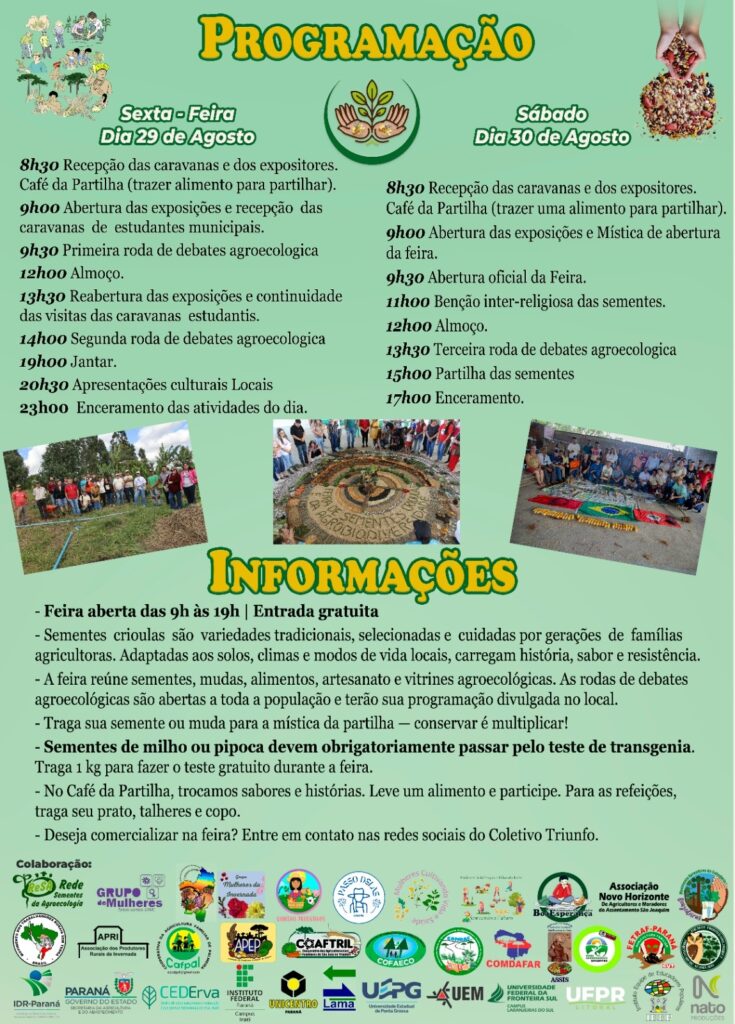 A programação do sábado começa às 8h30, com a recepção das caravanas e o Café da Partilha. Às 9h30 inicia a abertura oficial do evento, seguido de uma benção inter-religiosa das sementes, às 11 h. A abertura oficial ainda conta com o lançamento do projeto Terra Mesa, com os três estados do Sul e a presença de representantes do MDA. “A ideia é que eles conheçam, saibam como que está, como que funciona essa conservação da agrodiversidade nossa aqui também e entendam um pouco, também ajudem a gente porque temos várias coisas nisso”, explica o biólogo.