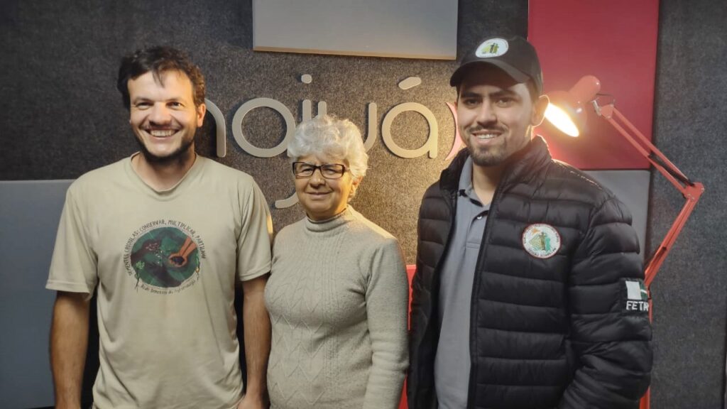 O biólogo Renato Kovalski Ribeiro, a assentada Neuri Da Trindade Pyzibilynski e o presidente do Sindicato dos Trabalhadores Rurais de Teixeira Soares, Welerson Cleiton Noble, falaram sobre a programação da 20ª Feira Regional de Sementes Crioulas e da Agrobiodiversidade em participação no programa “Meio Dia em Notícias” da Super Najuá. Foto: João Geraldo Mitz (Magoo)