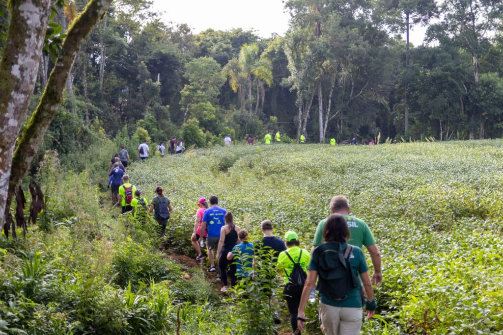 Márcio explica que as trilhas de nível fácil ou moderado são caracterizadas por trajetos planos e circulares, que geralmente começam e terminam no mesmo ponto. Esses percursos passam por propriedades rurais e áreas naturais, mas sem grandes desafios como subidas, cachoeiras ou travessias de correntezas. Já as trilhas moderadas podem incluir trechos com subidas e pequenas travessias, além de serem um pouco mais longas, com até 14 quilômetros. No caso da Caminhada no Pinho de Baixo, o trajeto é considerado de nível difícil, por envolver passagens por correntezas, descidas com corda, e trechos com aclives e declives acentuados, o que exige mais esforço físico dos participantes.