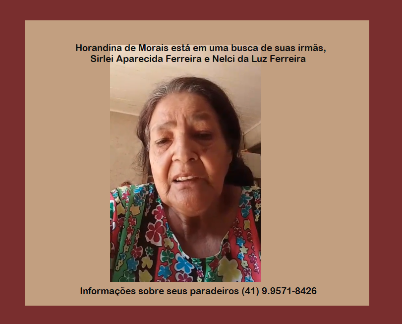 • Horandina de Morais está em uma busca de suas irmãs, Sirlei Aparecida Ferreira e Nelci da Luz Ferreira, que foram adotadas quando crianças e são naturais de Angai. Sirlei foi adotada por uma família em Irati, enquanto Nelci foi acolhida por outra em Ponta Grossa. Se você possui alguma informação sobre o paradeiro delas, por favor entre em contato (41) 9.9571-8426. Sua ajuda pode reunir essa família novamente.