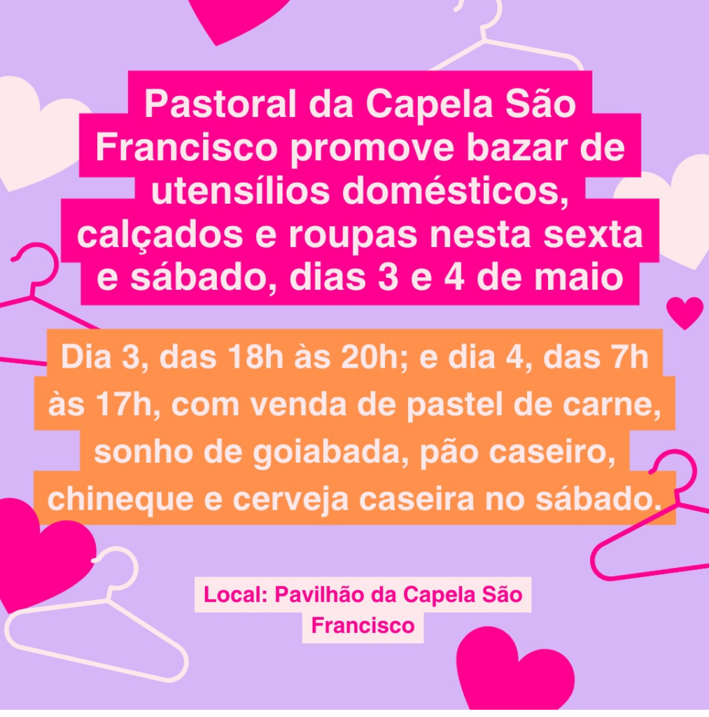 • Pastoral da Capela São Francisco promove bazar de utensílios domésticos, calçados e roupas, dias 03 e 04 de maio, no Pavilhão da Capela São Francisco. Dia 03, sexta-feira, das 18 às 20h e dia 04, sábado, das 07 às 17h, com venda de pastel de carne, sonho de goiabada, pão caseiro, chineque e cerveja caseira.