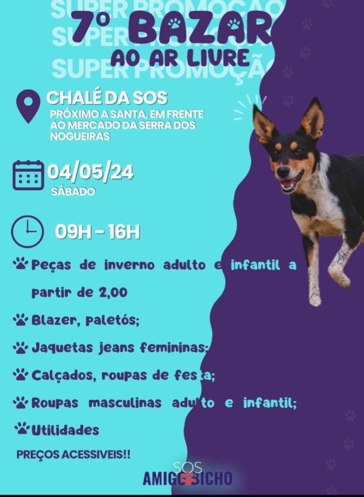 • Sábado, bazar da SOS Amigo Bicho no chalé na Avenida Ladislau Griczinski, 583, na Serra dos Nogueiras. Horário das 09 às 16 h. Haverá venda de peças de inverno adulto e infantil, a partir de R$ 2. Também serão vendidos blazers, paletós, jaquetas jeans femininas, calçados, roupas de festa, roupas masculinas adulto e infantil e utilidades com preços acessíveis. Participe e colabore com o SOS Amigo Bicho