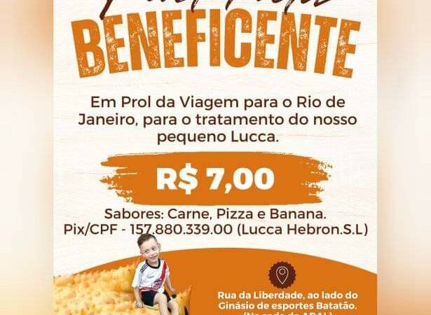 • Pastelada beneficente dia 18 de maio, a partir das 13h25m em prol da viagem para o Rio de Janeiro, para o tratamento do pequeno Lucca. Pastel de carne, pizza e banana ao preço de R$ 7,00 na sede da ARAI à Rua da Liberdade, ao lado do Ginásio de Esportes Batatão