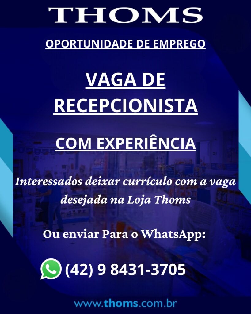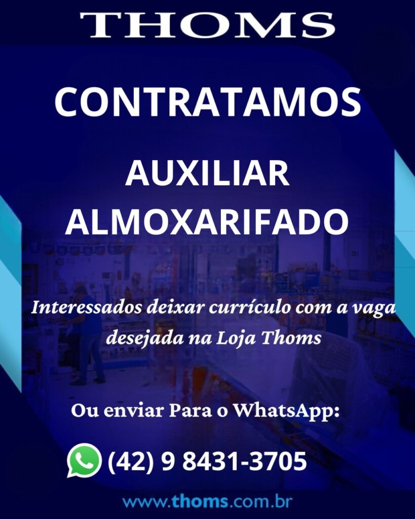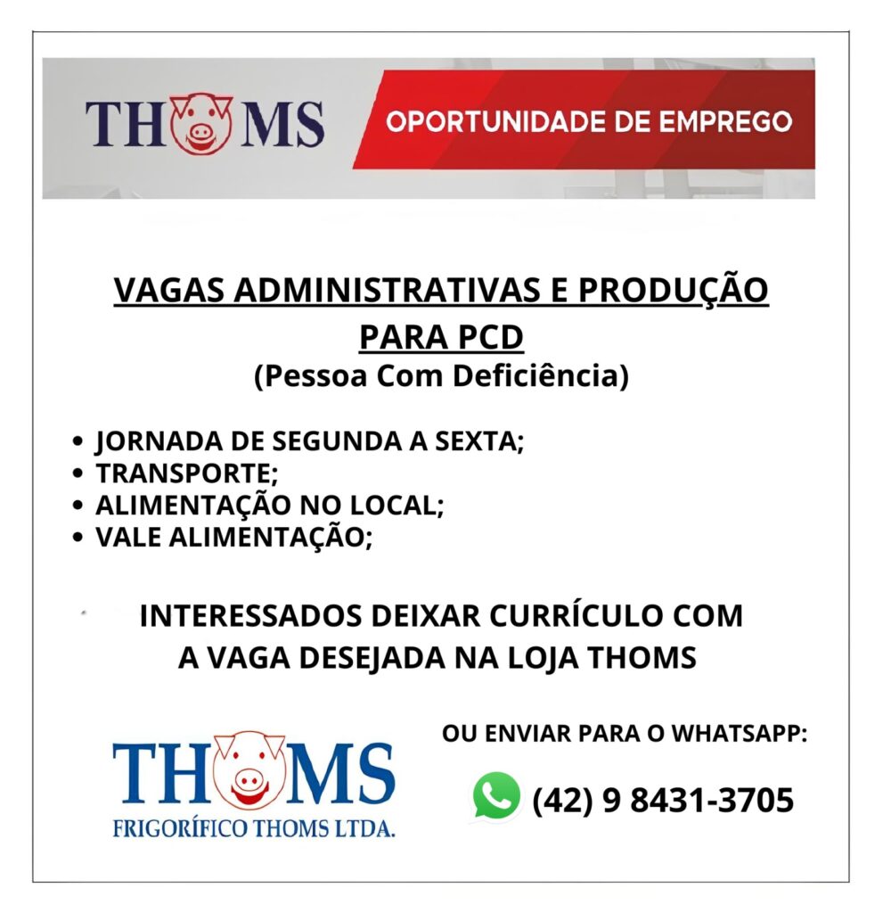 • A Loja Thoms dispõe de vagas para recepcionista com experiência e auxiliar de almoxarifado e o Frigorifico Thoms dispõe de vagas administrativas e produção para pessoas com deficiência, com jornada de segunda a sexta, transporte, alimentação no local e vale alimentação. Interessados deixar curriculo com a vaga desejada na Loja Thoms ou enviar para whats 9.8431-3705