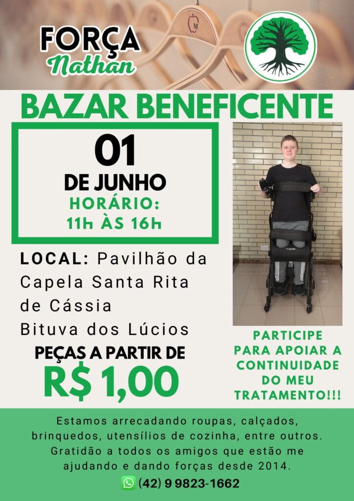 • Bazar Beneficente em prol do Nathan para dar continuidade a seu tratamento, dia 01 de junho no Pavilhão da Capela Santa Rita de Cassia em Bituva dos Lúcios, das 11h às 16h – Peças a partir de R$ 1,00