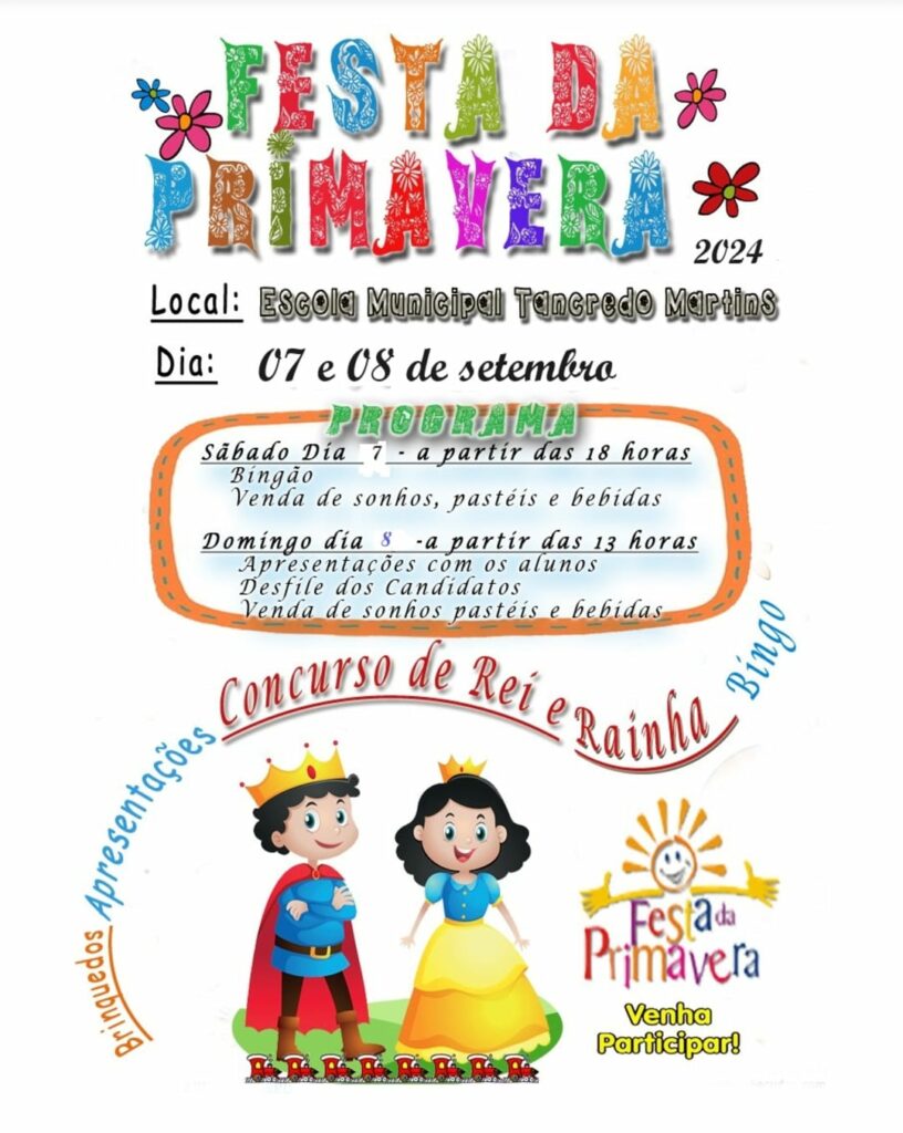 • Festa da Primavera, dias 07 e 08 de Setembro, na Escola Municipal Tancredo Martins. – Sábado – 18h bingão e venda de sonhos, pastéis e bebidas – Domingo – 13h apresentação com os alunos, desfile dos candidatos e venda de sonhos, pastéis e bebidas