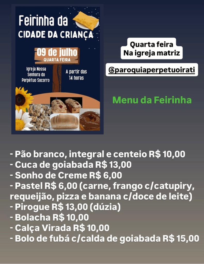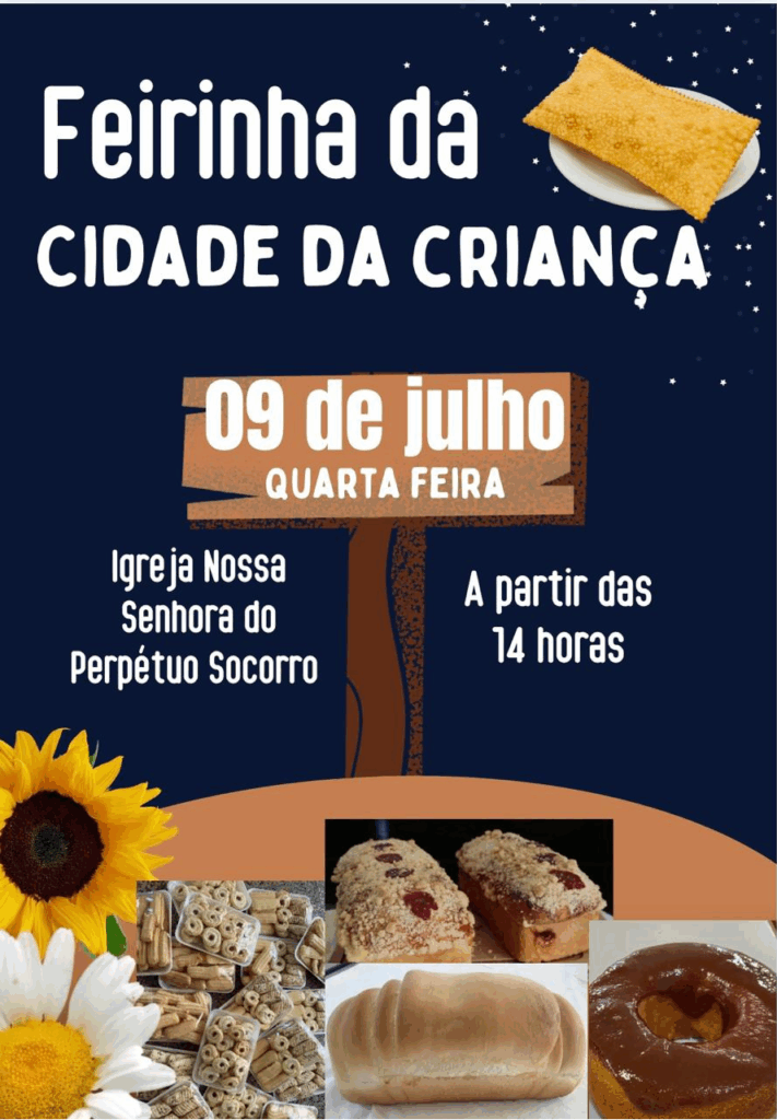 • Feirinha da Cidade da Criança, quarta-feira, a partir das 14h na Igreja Nossa Senhora do Perpetuo Socorro
