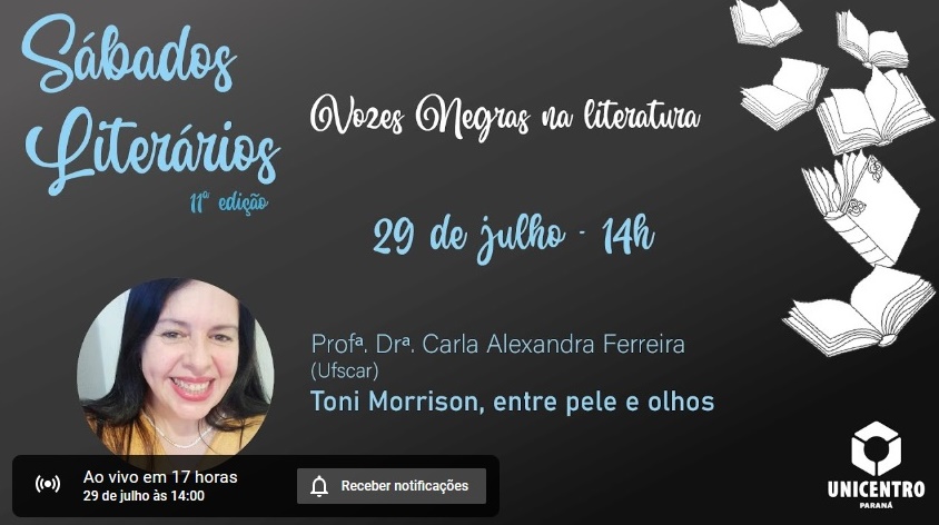 Neste sábado, a partir das 14h, será transmitido o 6º encontro dos Sábados Literários em 2023. A palestrante será a professora doutora Carla Alexandra Ferreira, da Universidade Federal de São Carlos, que vai tratar sobre o tema: “Toni Morrison, entre peles e olhos”.