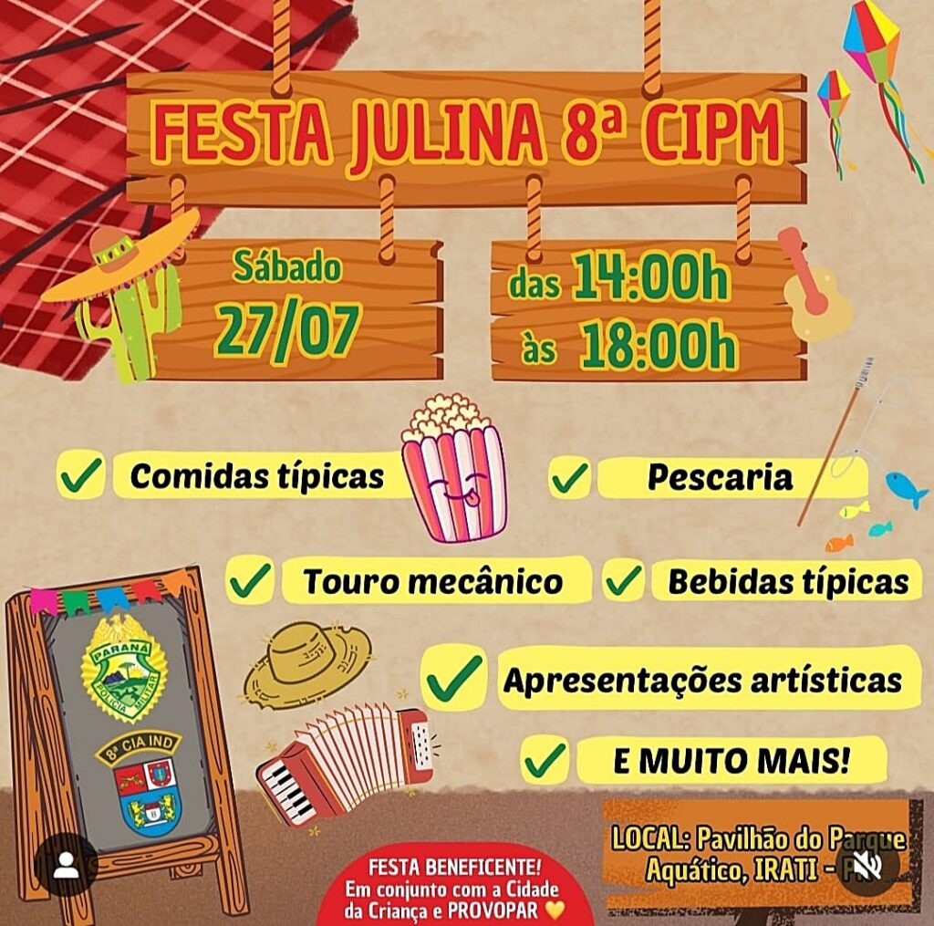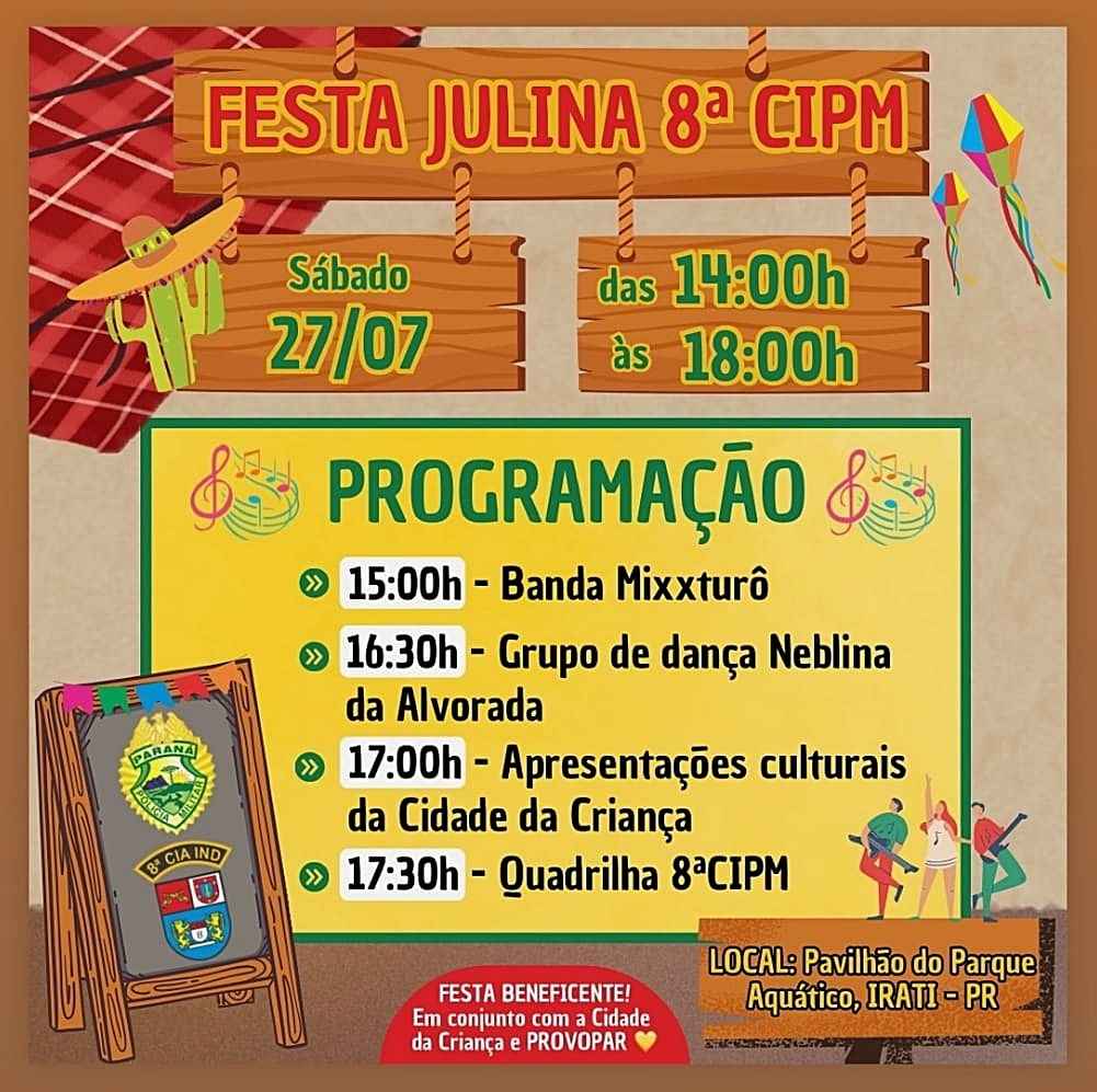 Neste sábado, dia 27, a 8ª Cia de Irati promoverá a 1ª Festa Julina Militar Beneficente no pavilhão de exposições João Wasilewski, no Parque Aquático, na rua Expedicionário José de Lima, no bairro Rio Bonito. O horário do evento será das 14 às 18h.