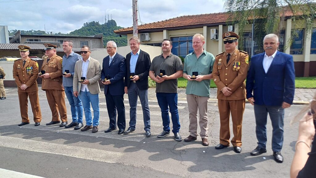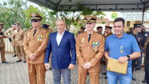 Durante o evento, policiais foram homenageados com medalhas. Autoridades e representantes da comunidade regional receberam moedas de mérito da Polícia Militar.