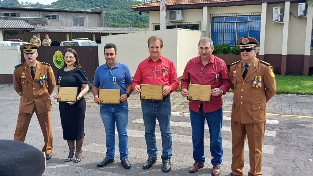 Já as moedas de mérito da PM foram entregues para Edson Paulo Klemba, vereador de Rio Azul, Anderson Neiverth, vereador de Imbituva, Orrevaldir Loch de Paula, vereador de Ivaí, José Maurício Batista Chaves, assessor do deputado estadual Hussein Bakri (PSD), líder do governo na Assembleia, e também para João Dib Endraues Júnior, presidente do Conselho de Segurança Pública de Teixeira Soares, Fábio Bobato, empresário de Imbituva, José Kosera Neto, empresário de Irati, João Gilmar Neck Nizer, empresário, e Norton Luiz Sar, gerente da agência do Sicredi de Inácio Martins.