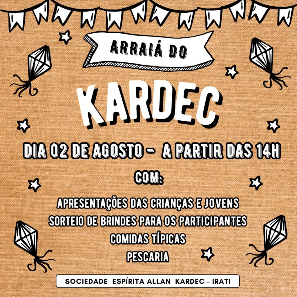• Arraiá do Kardec dia 02 de agosto a partir das 14hs na Sede da Sociedade Espirita Alan Kardec em Irati – Rua México, 65. Haverá apresentação das crianças e jovens, sorteio de brindes, comidas típicas e pescaria. Os recursos arrecadados serão utilizados para as aulas de evangelização de crianças e jovens.