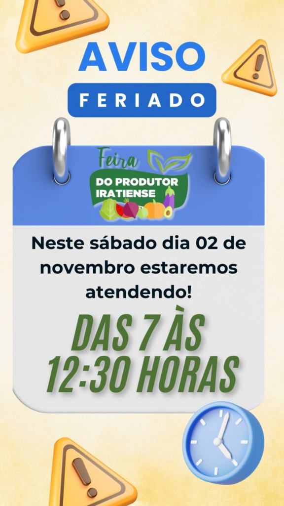 • A Feira do Produtor Iratiense comunica que estará atendendo neste sábado, dia 02, das 07h00 às 12h30