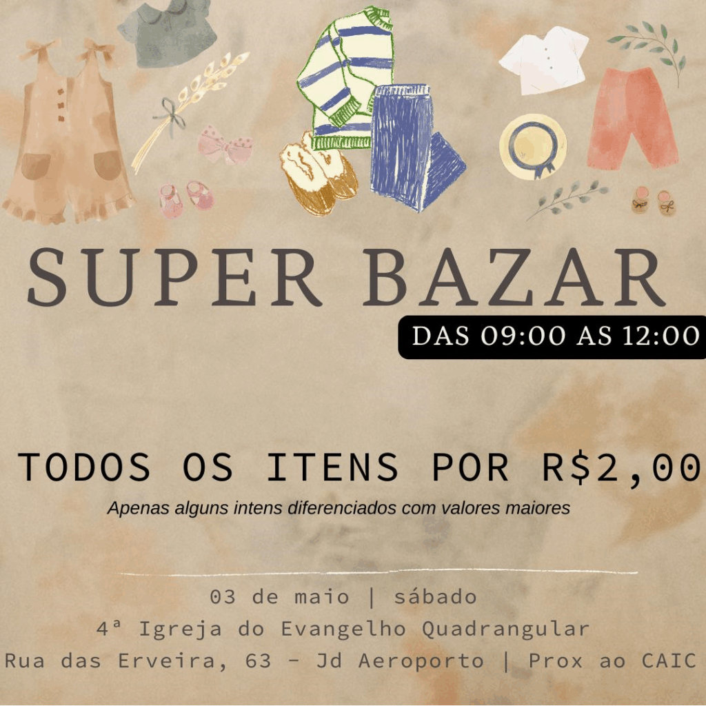• Bazar neste sábado das 09 às 12h na 4ª Igreja do Evangelho Quadrangular – Rua das Erveiras, 63 – Jardim Aeroporto proximidades do Caic. Todos os itens por R$ 2,00 – apenas alguns itens diferenciados com valores maiores