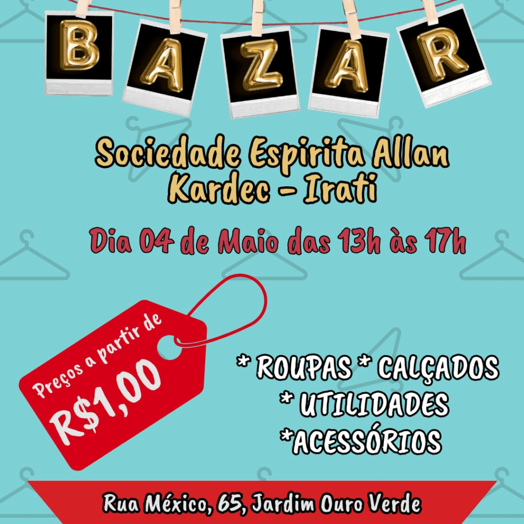- Bazar Sociedade Espirita Alan Kardec dia 04 de maio, das 13hs as 17hs, na Rua Mexico, 65 – Jardim Ouro Verde. Peças a partir de R$ 1,00. Terão roupas, calçados, utilidades e acessórios.