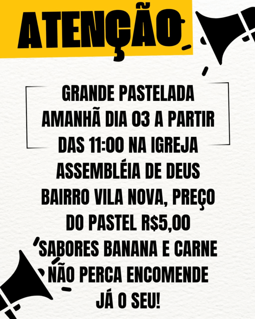 - Pastelada dia 03 de maio a partir das 11h na Igreja Assembleia de Deus no Bairro Vila Nova. Pastel R$ 5,00 – sabores banana e carne