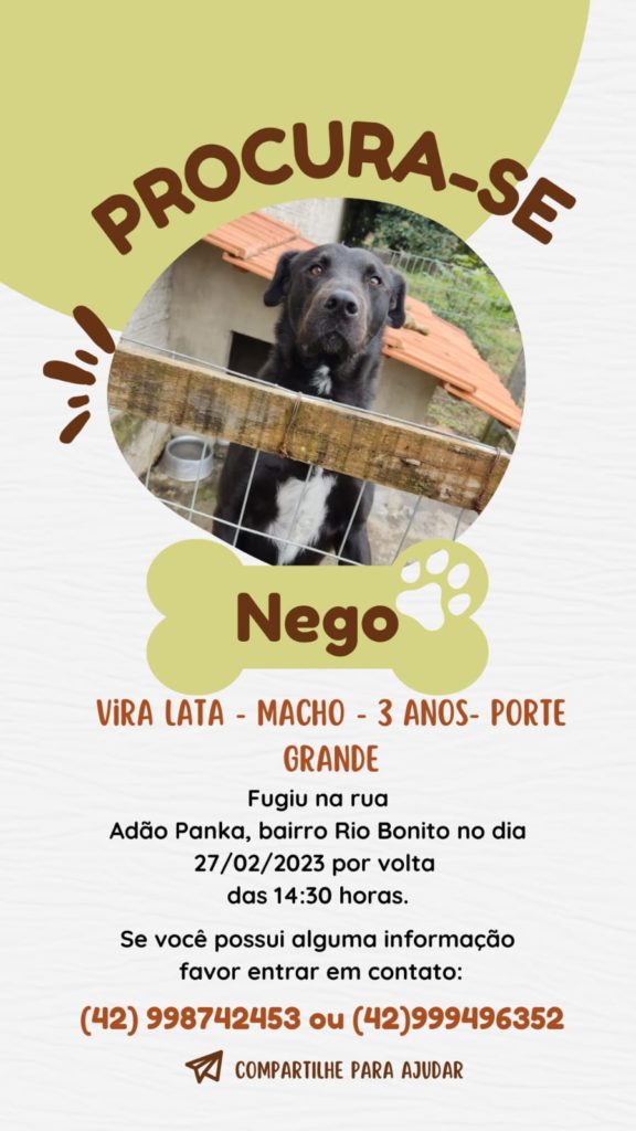Desapareceu segunda-feira, por volta de 14h30m da Rua Adão Panka, no Rio Bonito, um cachorro vira lata, com 3 anos, porte grande, pelagem curta preta com mancha branca no peito. Atende por Nego. Quem souber de seu paradeiro, informar 9.9949-6352, mediante gratificação de R$ 500,00.