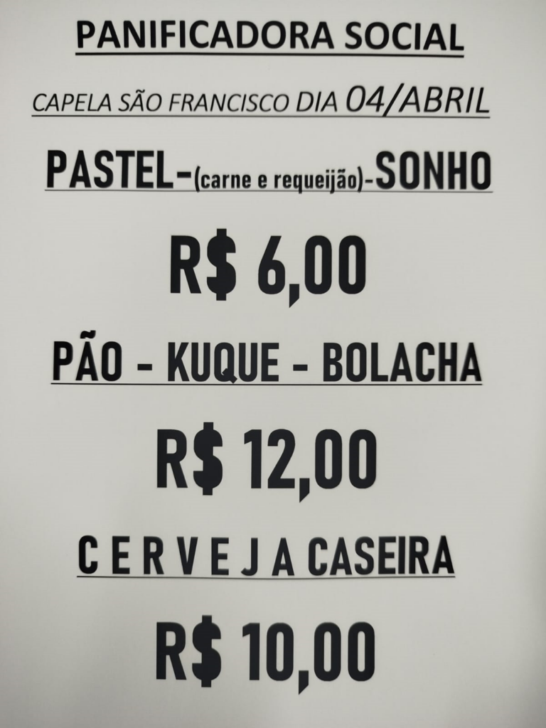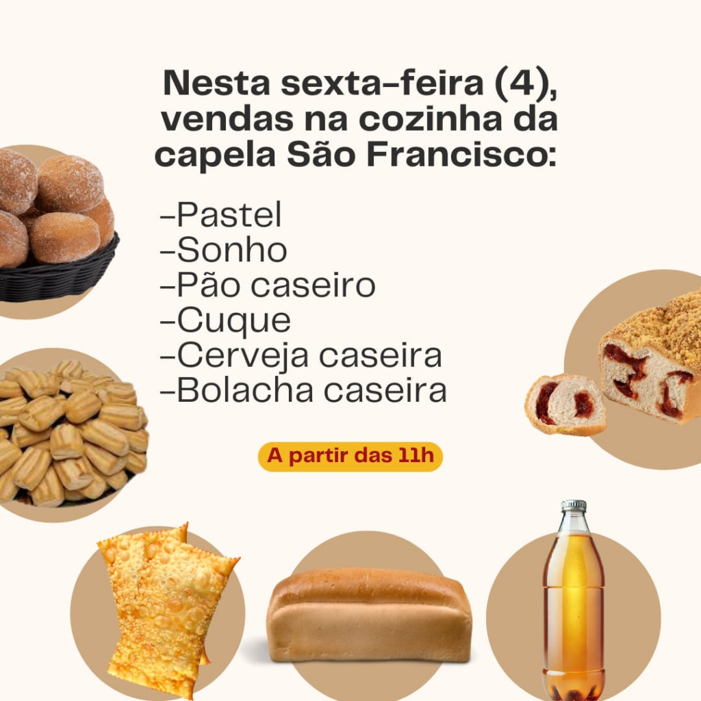 • Sexta-feira, na Capela São Francisco venda de pastel, sonho, pão caseiro, cuque, cerveja caseira, bolacha caseira a partir das 11h