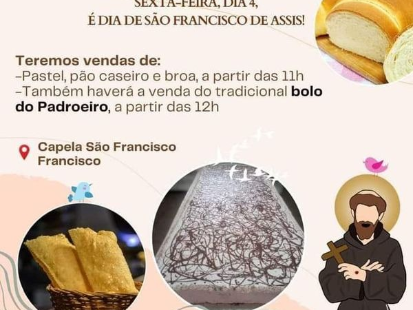 • Sexta-feira, é dia de São Francisco de Assis! Haverá venda de pastel, pão caseiro e broa, a partir das 11h, na Capela São Francisco – Também haverá venda do tradicional bolo do padroeiro, a partir das 12h