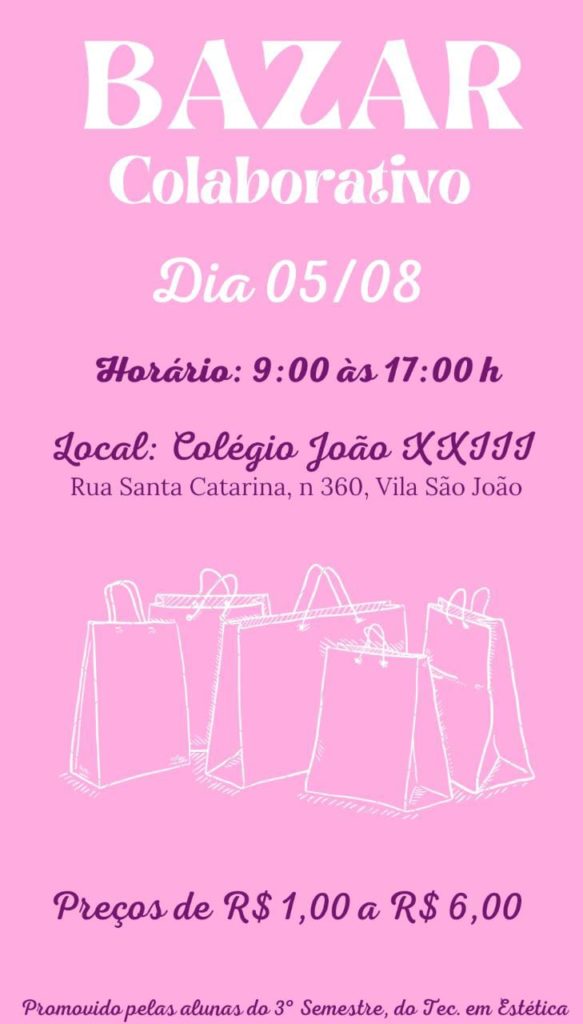 Bazar Colaborativo, sábado, dia 05, das 09h às 17h, no Colégio João 23 na Rua Santa Catarina, 360 na Vila São João. Preços de R$ 1,00 a R$ 6,00
