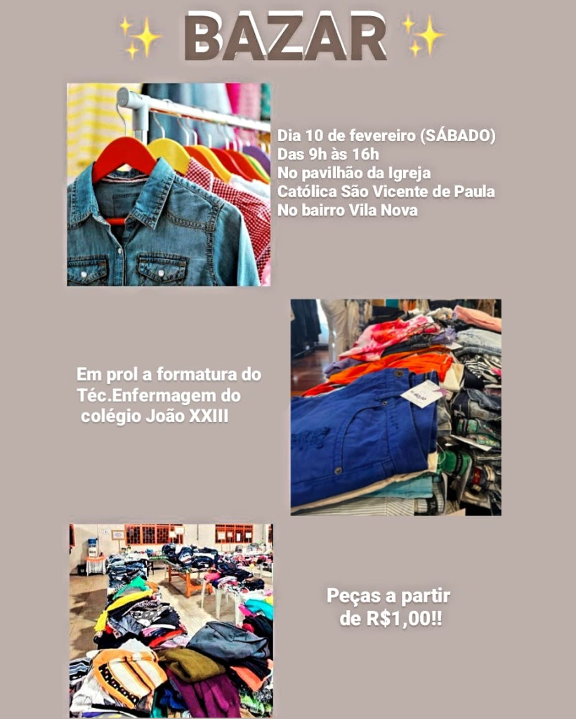 • Bazar sábado, dia 10, no Pavilhão da Igreja São Vicente de Paula na Vila Nova, no horário das 09 às 16h, em prol da formatura do Técnico em Enfermagem do Colégio João 23. Peças a partir de R$ 1,00