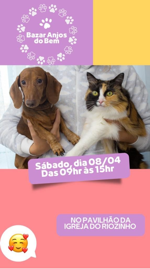 Bazar Anjos do Bem (protetores de animais de rua), sábado, dia 08, das 09h às 15h, no pavilhão da Igreja de Riozinho. Toda arrecadação será em prol dos cuidados com cães de rua. Aceitam doações.