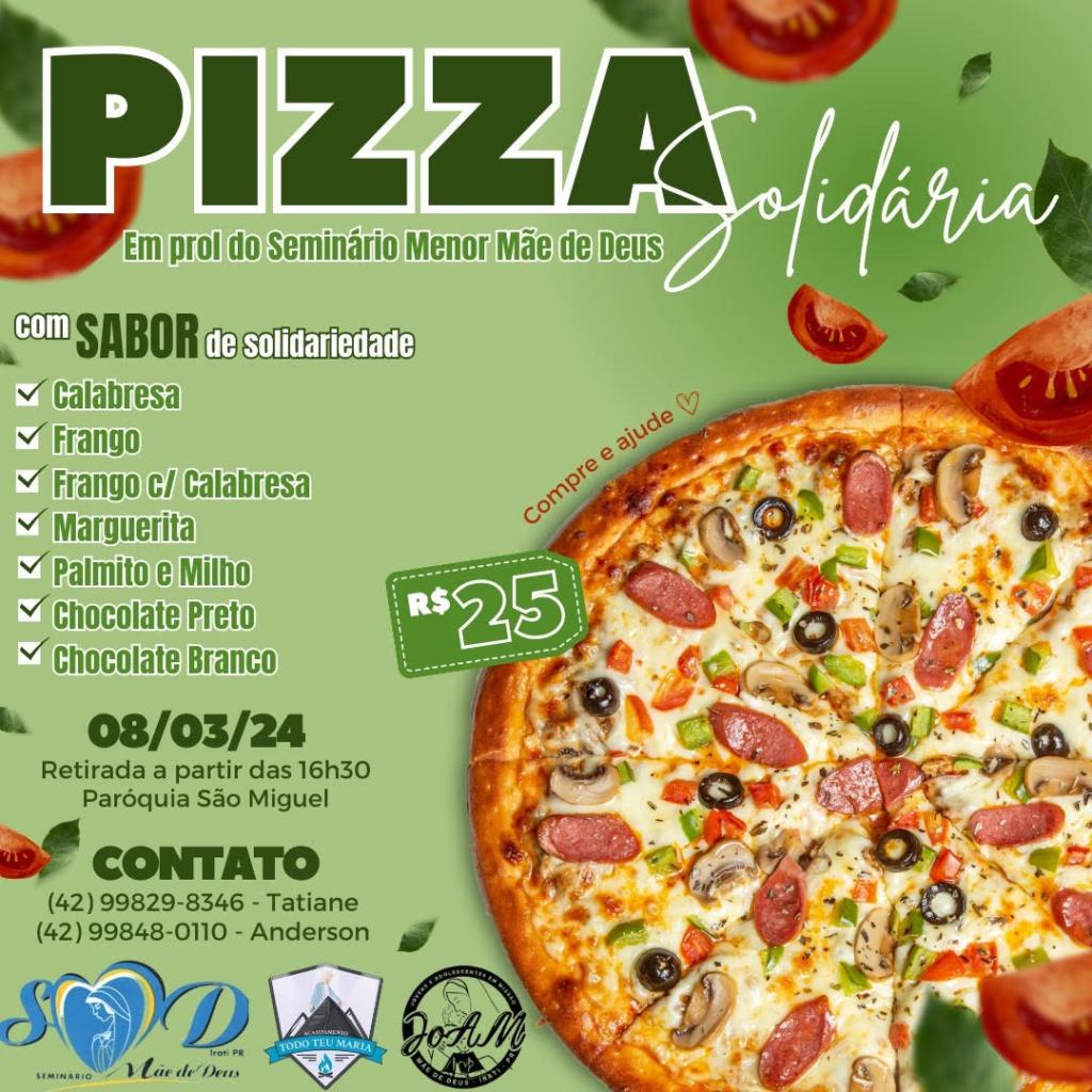 • Pizza Solidária em prol do Seminário Menor Mãe de Deus, sexta-feira, a partir das 16h30 na Paróquia São Miguel, ao preço de R$ 25,00 cada. Pizza de calabresa, frango, frango com calabresa, marguerita, palmito e milho, chocolate preto e branco. Contato: Tatiane 9.9829-8346 ou Anderson 9.9848-0110