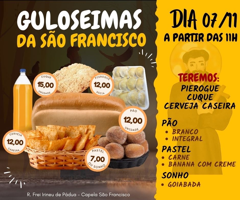 • Guloseimas da São Francisco, sexta-feira, a partir das 11h – Haverá pierogue, cuque, cerveja caseira, pão branco e integral, pastel de carne e banana com creme, sonho de goiabada, no Pavilhão da Capela São Francisco