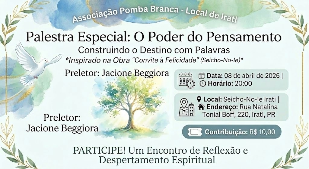 • Palestra Especial O Poder do Pensamento – Construindo o destino com palavras (inspirado na obra “Convite à Felicidade” (Seicho-No-Ie), dia 08 de abril, com início às 20h, na Seicho-No-Ie Irati com Preletor: Jacione Beggiora. Contribuição: R$ 10,00