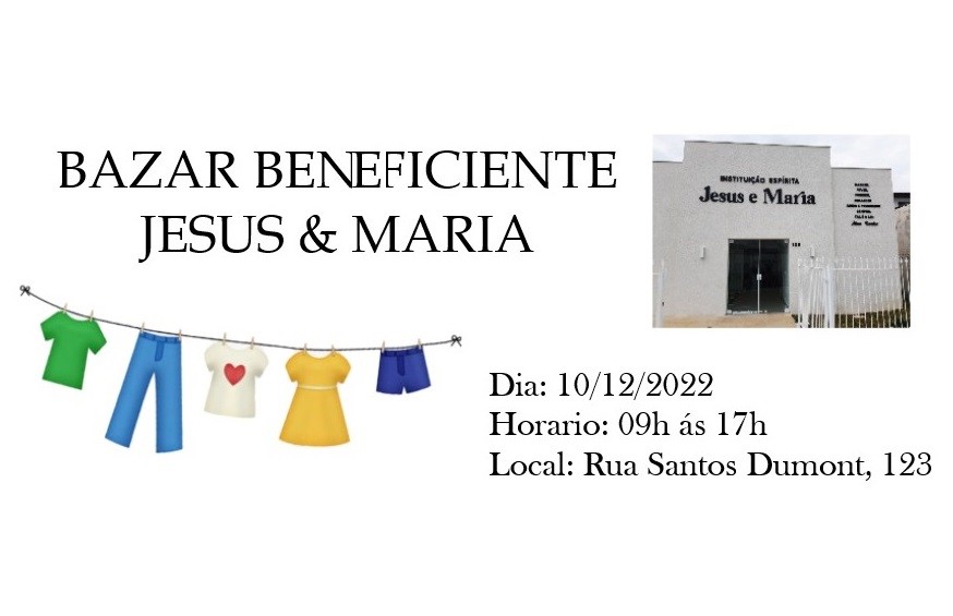 Bazar Beneficente na Instituição Espírita “Jesus e Maria”, sábado, dia 10, das 09h às 17h na Rua Santos Dumont, 123