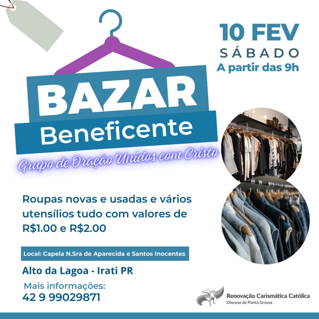 Bazar na capela Nossa Senhora Aparecida e Santos Inocentes no Alto da Lagoa, sábado a partir das 09h, ao preço de R$ 1,00 e R$ 2,00 a peça.