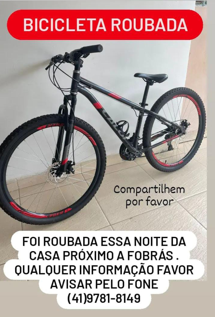 Foi roubada de residência próxima a Fobrás, bicicleta Caloi. Qualquer informação poderá ser dada (41) 9.9781-8149.