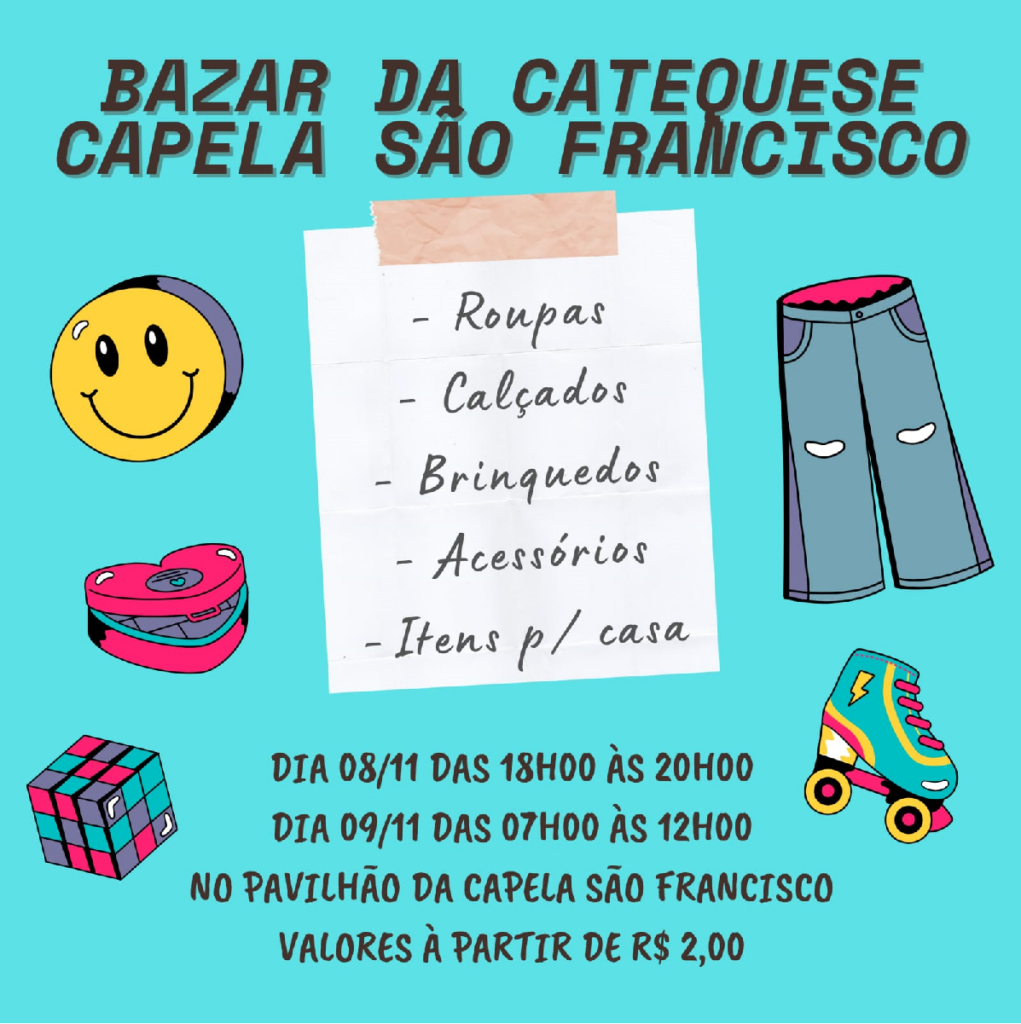 • Bazar da Catequese da Capela São Francisco, sexta-feira, das 18h às 20h e sábado das 07h às 12h, com valores a partir de R$ 2,00 – Bazar de roupas, calçados, brinquedos, acessórios e itens para casa