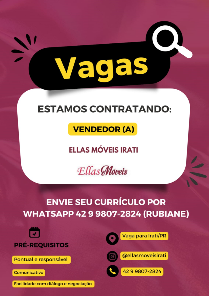 • Ellas Moveis da Vila São João está contratando vendedor (a). Interessados enviar curriculo para Rubiane whats (42) 9.9807-2824