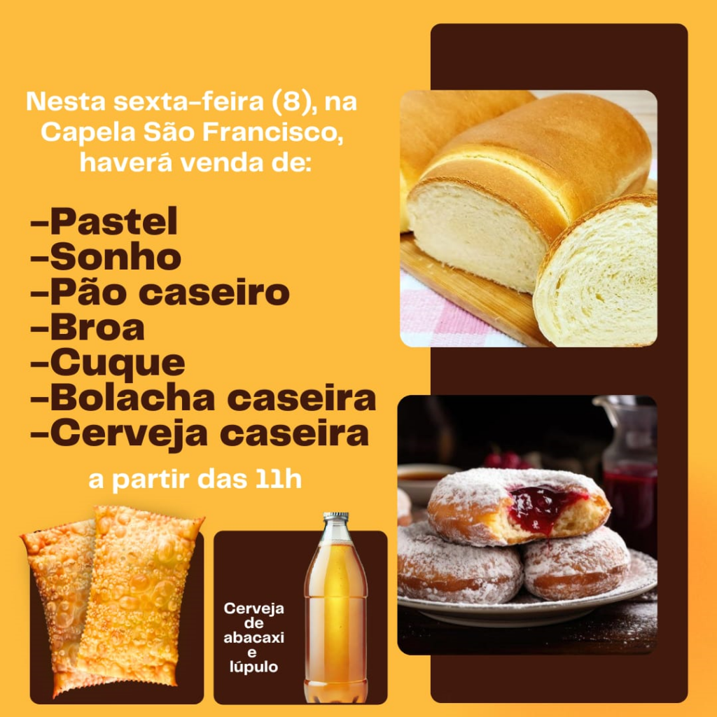 • Sexta-feira, dia 08, na Capela São Francisco, venda de: pastel, sonho, pão caseiro, broa, cuque, bolacha caseira, cerveja caseira, a partir das 11h