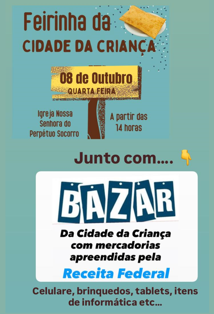 • A feirinha mensal da Cidade da Criança de Irati será realizada na quarta-feira, a partir das 14h, na Paróquia Perpétuo Socorro. Haverá vendas de pastéis de carne, requeijão, pizza e banana com doce de leite, sonho de creme e goiabada, cuca, pães, calça virada e bolacha. Durante a feira, às funcionárias da Cidade da Criança também realizarão a venda das mercadorias doadas pela Receita Federal, como celulares, brinquedos, tablets, produtos de informática, entre outros. A feirinha da Cidade da Criança acontece na segunda quarta-feira de cada mês na Paróquia Perpétuo Socorro, localizada na rua Lino Esculápio, nº 30, ao lado do Parque Aquático.