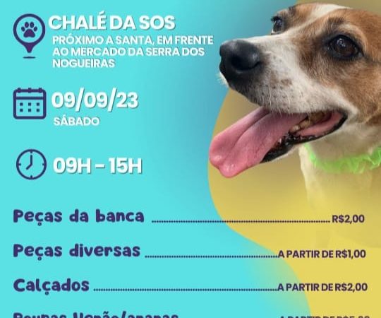 2º Bazar ao Ar Livre, sábado (dia 09), das 09 às 15h no Chalé da SOS, próximo a Santa, em frente ao Mercado da Serra. Peças da banca – R$ 2,00 – Peças diversas a partir de R$ 1,00 – calçados a partir de 2,00 – roupas verão/araras a partir de R$ 5,00