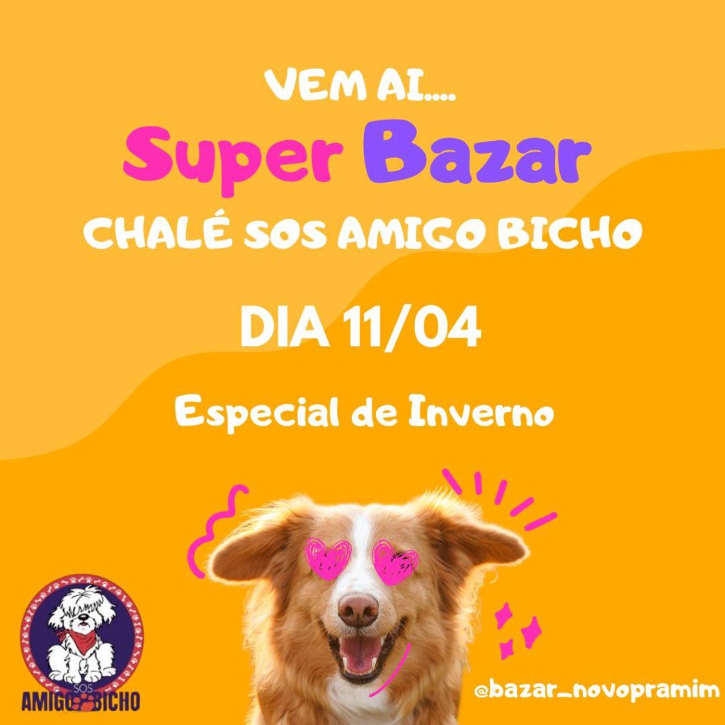 • Super Bazar Especial de Inverno, com lindas peças a preços acessíveis, sábado (dia 11), no Chalé SOS Amigo Bicho, próximo à rotatória da Colina Nossa Senhora das Graças e ao Supermercado Serra, no horário: das 13h30 às 16h30 – Toda a renda arrecadada é utilizada para despesas de combustível, medicações e demais necessidades dos animais. Participe também adotando um cão do abrigo.