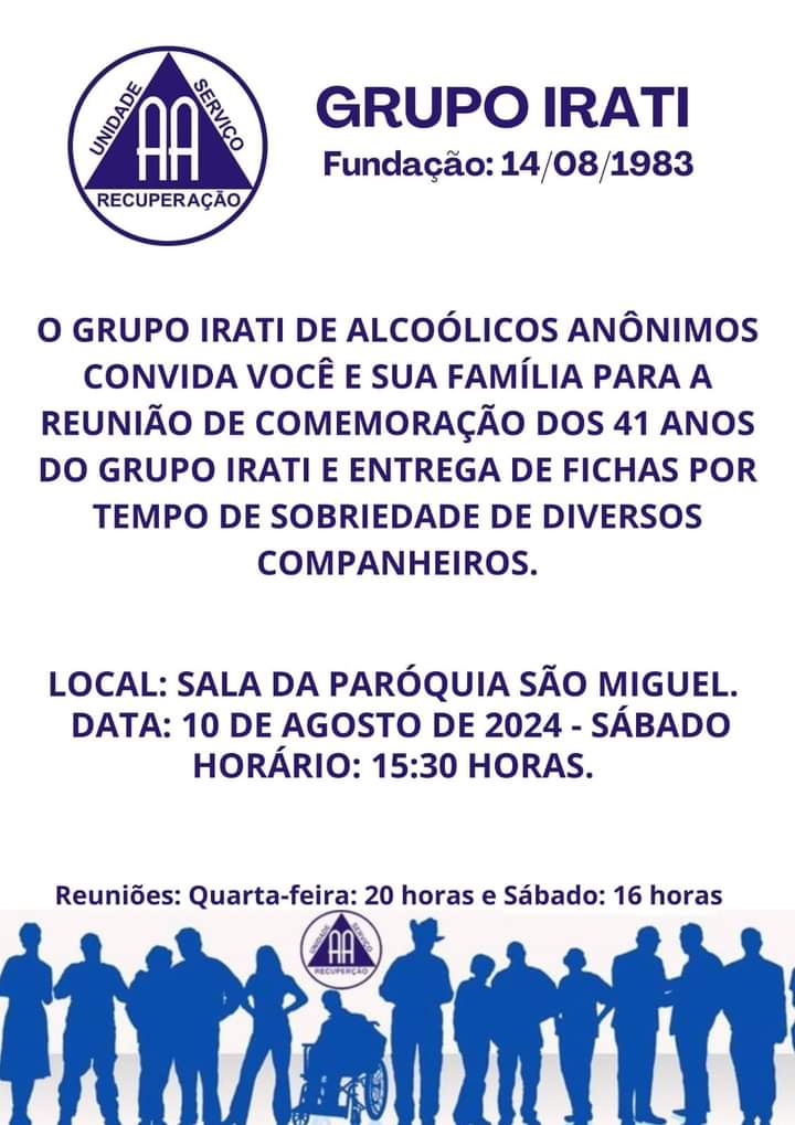 • O Grupo Irati de Alcoólicos Anônimos convida você e sua família para a reunião em comemoração aos 41 anos do Grupo Irati e entrega de fichas por tempo de sobriedade de diversos companheiros, sábado, dia 10, na sala da Paróquia São Miguel, com início às 15h30m