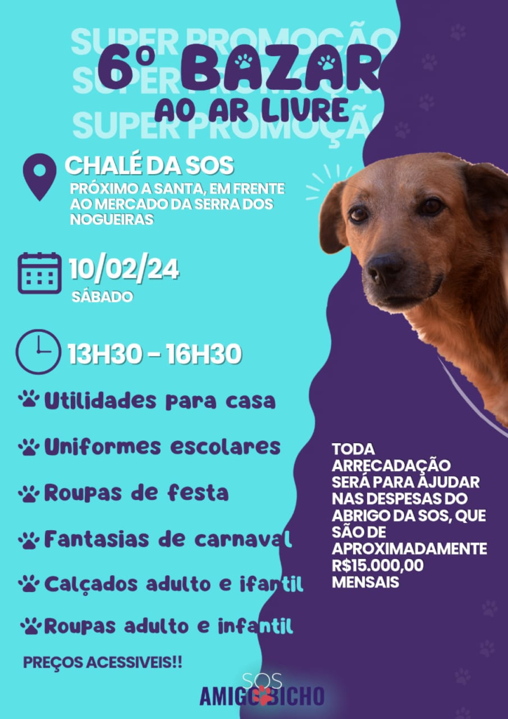 SOS AMIGO BICHO promove 6º BAZAR AO AR LIVRE, sábado (dia 10), das 13h30 às 16h30 no Chalé da SOS próximo a Santa, em frente ao Mercado da Serra dos Nogueiras. Utilidades para casa, uniformes escolares, roupas de festa, fantasias de carnaval, calçados e roupas adulto e infantil. Preços acessíveis. Toda arrecadação será para ajudar nas despesas do abrigo da SOS, que são de aproximadamente R$ 15.000,00 mensais.