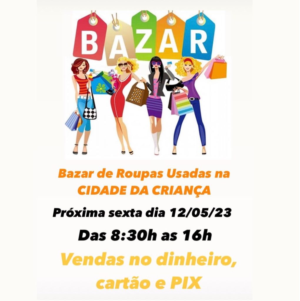 Bazar de Roupas usadas na Cidade da Criança, sexta-feira, dia 12, das 08h30 às 16h00 – Vendas no dinheiro, cartão e PIX.