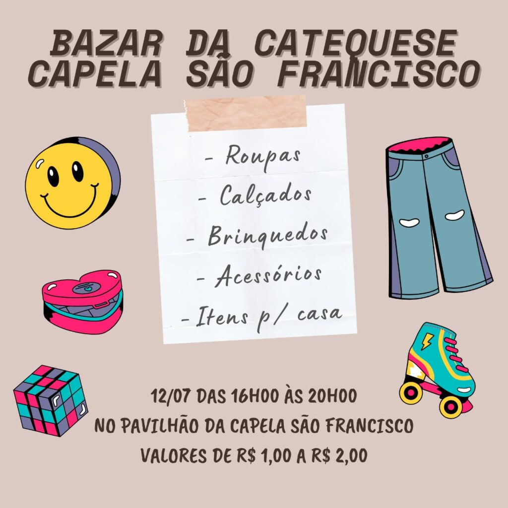 • Bazar da Catequese no Pavilhão da Capela São Francisco, nesta sexta-feira, das 16h às 20h. Você vai encontrar: roupas, calçados, brinquedos, acessórios e itens para casa, com preços a partir de R$ 1,00 até R$ 2,00.