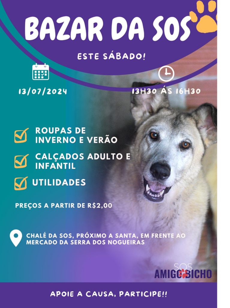 • Bazar da SOS Amigo Bicho, neste sábado, das 13h30m às 16h30m, com roupas de inverno e verão, calçados adulto e infantil e utilidades com peças a partir de R$ 2,00 – Chalé da SOS fica próximo a Santa, em frente ao Mercado da Serra dos Nogueiras.