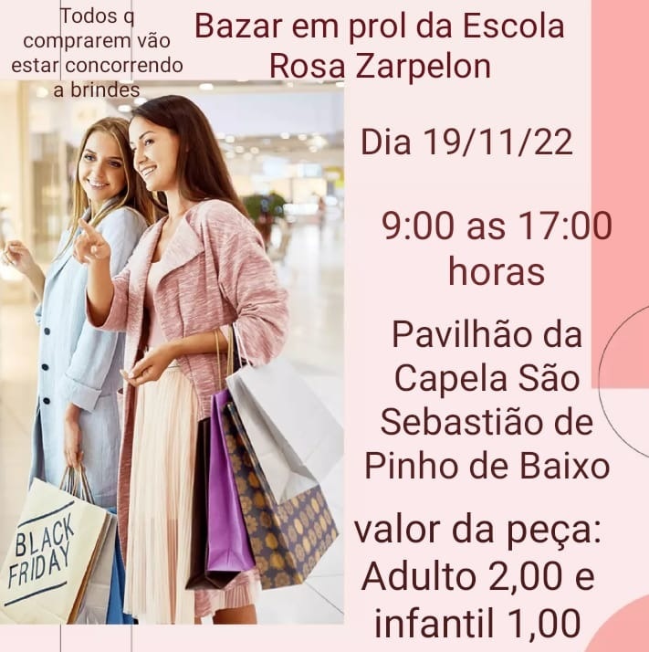 • Bazar em prol da Escola Rosa Zarpelon, dia 19 de novembro, das 09 às 17h no Pavilhão da Capela São Sebastião de Pinho de Baixo. Peças: Adulto R$ 2,00 e infantil R$ 1,00