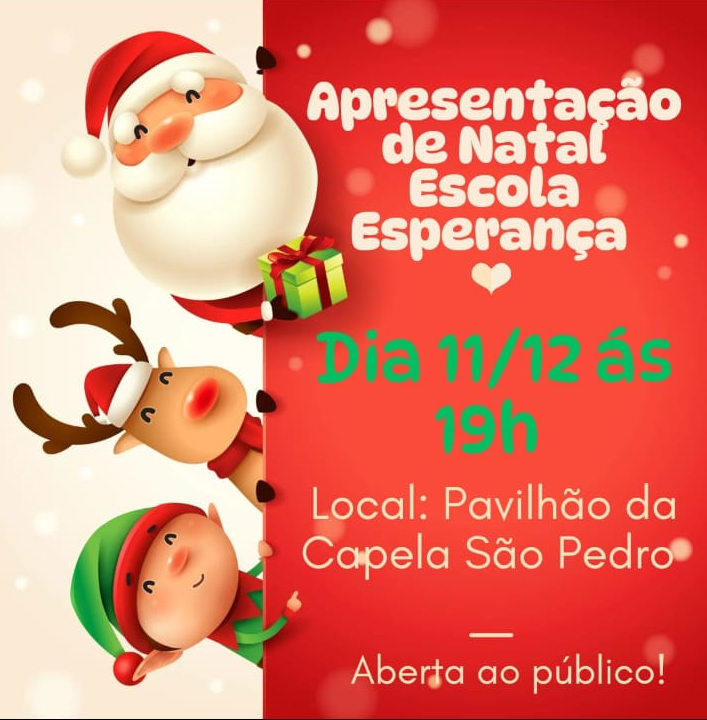 • Apresentação de Natal Escola Esperança, quarta-feira, às 19h no Pavilhão da Capela São Pedro em Guamirim. Aberto ao público!