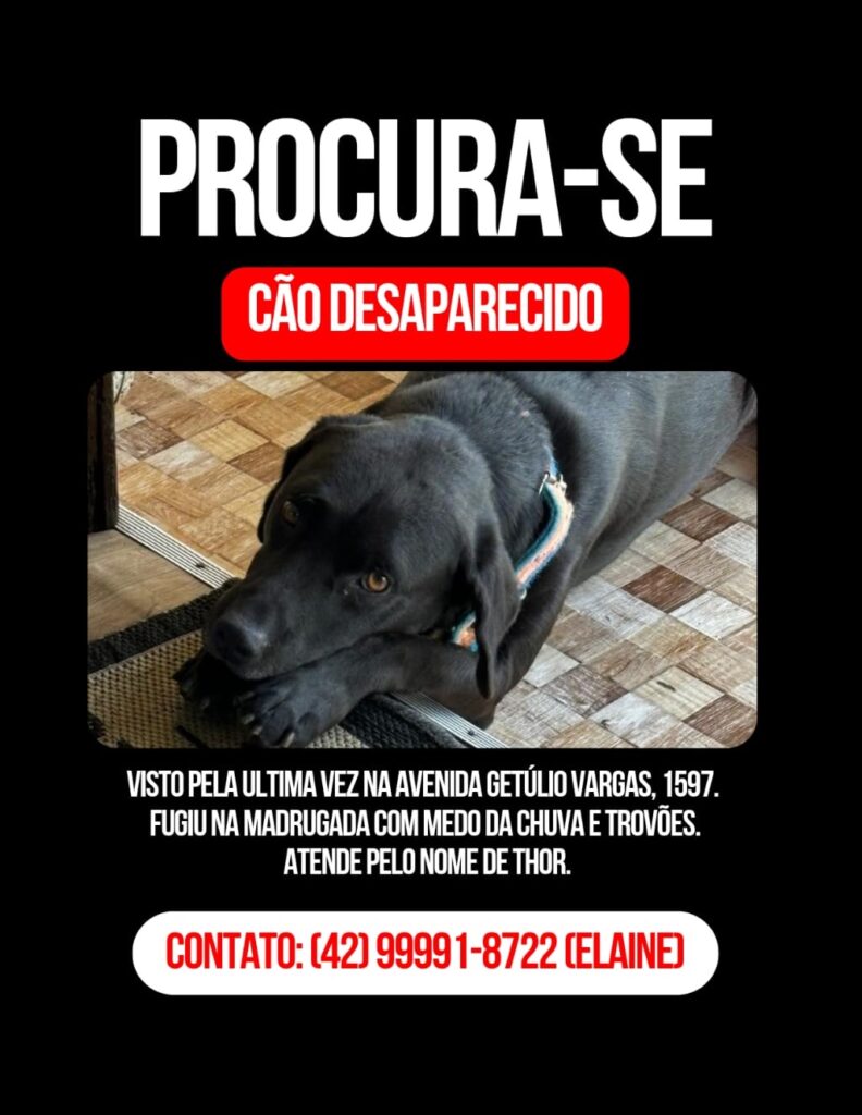 • Desapareceu um cachorro mestiço de labrador, porte grande, preto com pequena mancha branca no peito. Atende por Thor. Foi visto pela última vez na Avenida Getúlio Vargas. Contato Elaine 9.9991-8722