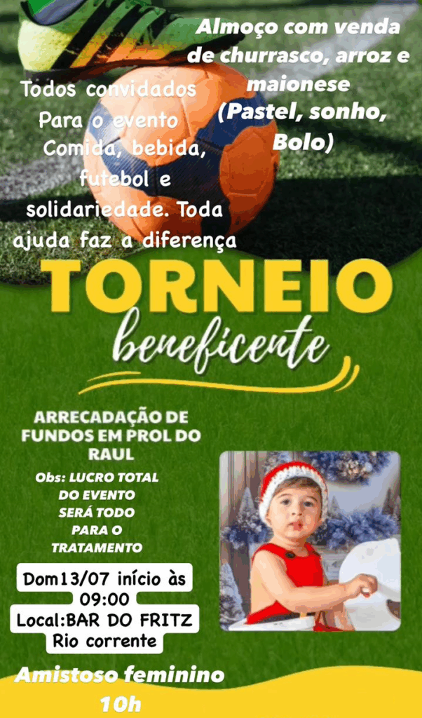 Torneio de futebol beneficente, domingo (dia 13), no Bar do Fritz em Rio Corrente. O lucro será em prol do tratamento de saúde de Raul Correa, conhecido por Raulzinho.